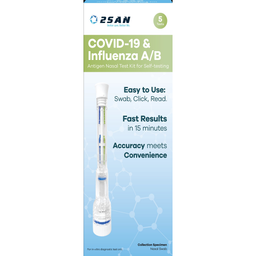 2San Covid-19 & Influenza A/B Pen Test 5 Pack for self-testing detects Covid-19, Influenza A, and Influenza B simultaneosly with just one swab.