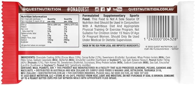 How do you make Peanut Butter Cups even better? By making them sweet without all the sugar. Each two-pack has 11g of protein and less than 1g of sugar! Due to global supply chain issues, Quest recently reformulated some of its products to contain soy lecithin and/or vegetable oil including soybean which is considered an allergen. The small amount contained within the product will not change the quality, flavor or texture of the product. We remain committed to using the high quality dairy-based proteins to help give you the amino acids you need.