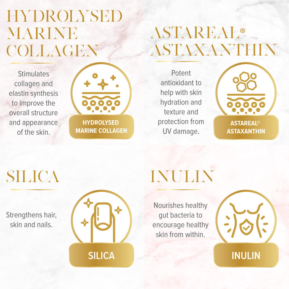 - Easily digestible marine collagen to stimulate collagen & elastin synthesis