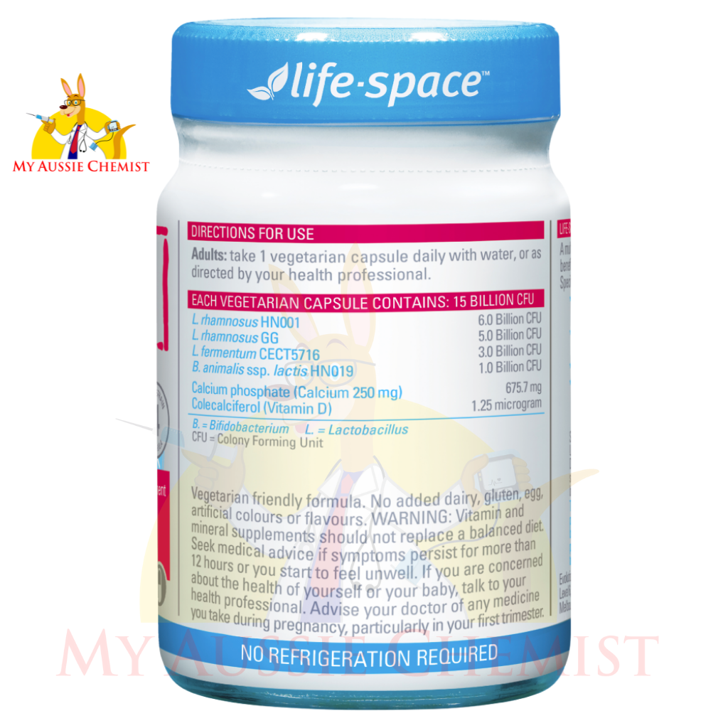 SUITABLE FOR VEGETARIANS. FRIDGE FREE - NO REFRIGERATION REQUIRED. NO ADDED DAIRY, GLUTEN, EGG, ARTIFICIAL COLOURS OR FLAVOURS. THIS LIFE-SPACE PRODUCT IS F ORMULATED, BLENDED, ENCAPSULATED, PACKAGED AND QUALITY TESTED IN AUSTRALIA.