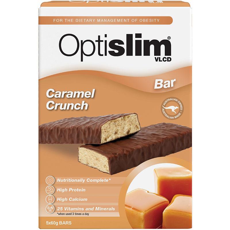 The Optislim VLCD (very low calorie diet) Caramel Crunch bar is a nutritionally balanced total meal replacement designed for people requiring a practical weight management program. It contains all your daily nutritional requirements, including 25 vitamins and minerals when you use three bars per day. Remember to maintain adequate fluid intake.  We recommend that a minimum of 2 litres of water is consumed per day