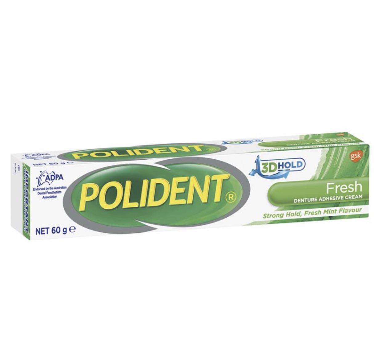 Apply Polident Denture Adhesive Cream once a day to clean, dry dentures, in short strips as indicated on back of pack, not too close to denture edges. 2. Rinse mouth before inserting denture (or partial denture), press dentures into place, hold firmly and bite down for a few seconds to secure hold.