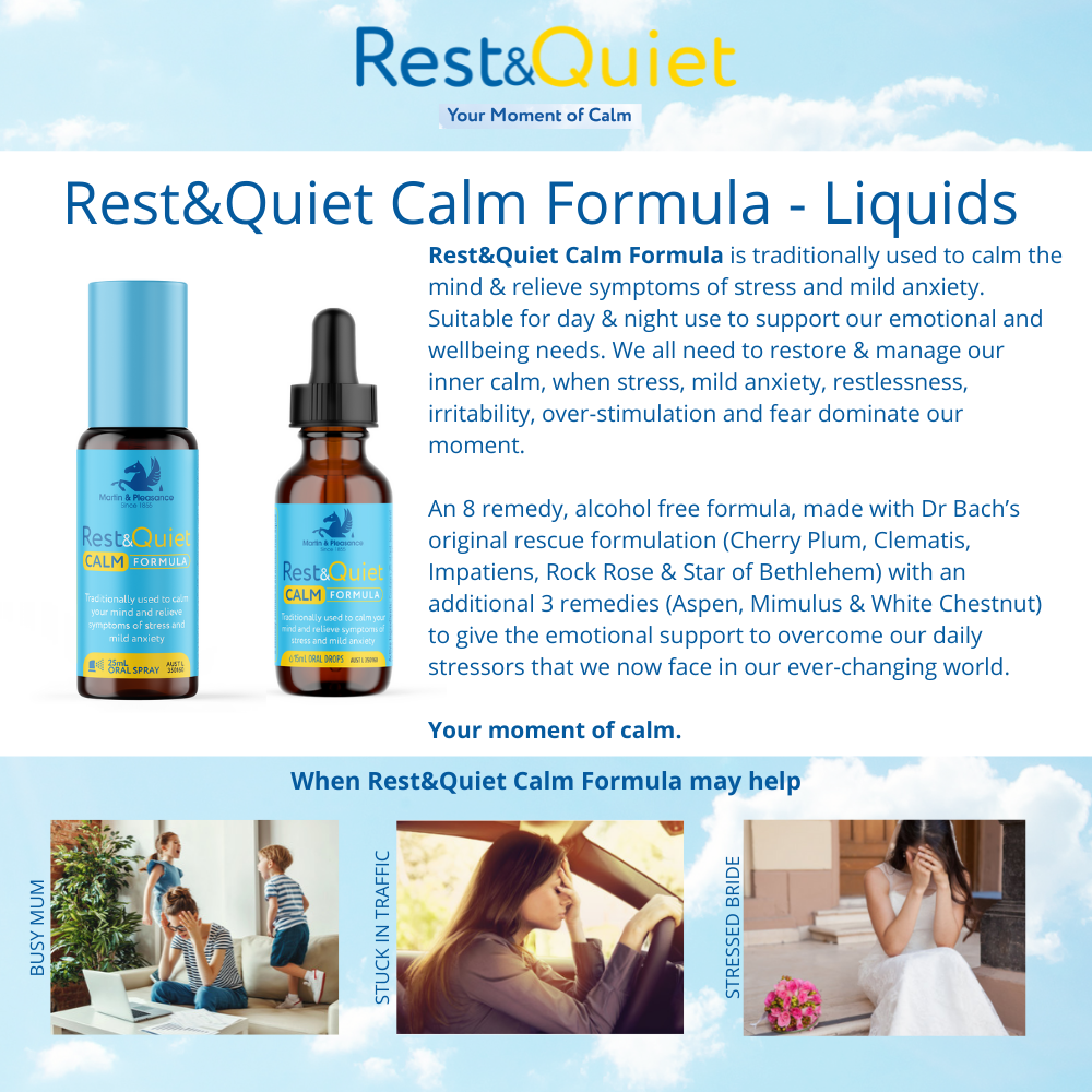 Rest&Quiet Calm Formula is traditionally used to calm the mind & relieve symptoms of stress and mild anxiety. Suitable for day & night use to support our emotional and wellbeing needs. We all need to restore & manage our inner calm, when stress, mild anxiety, restlessness, irritability, over-stimulation, and fear dominate our moment.