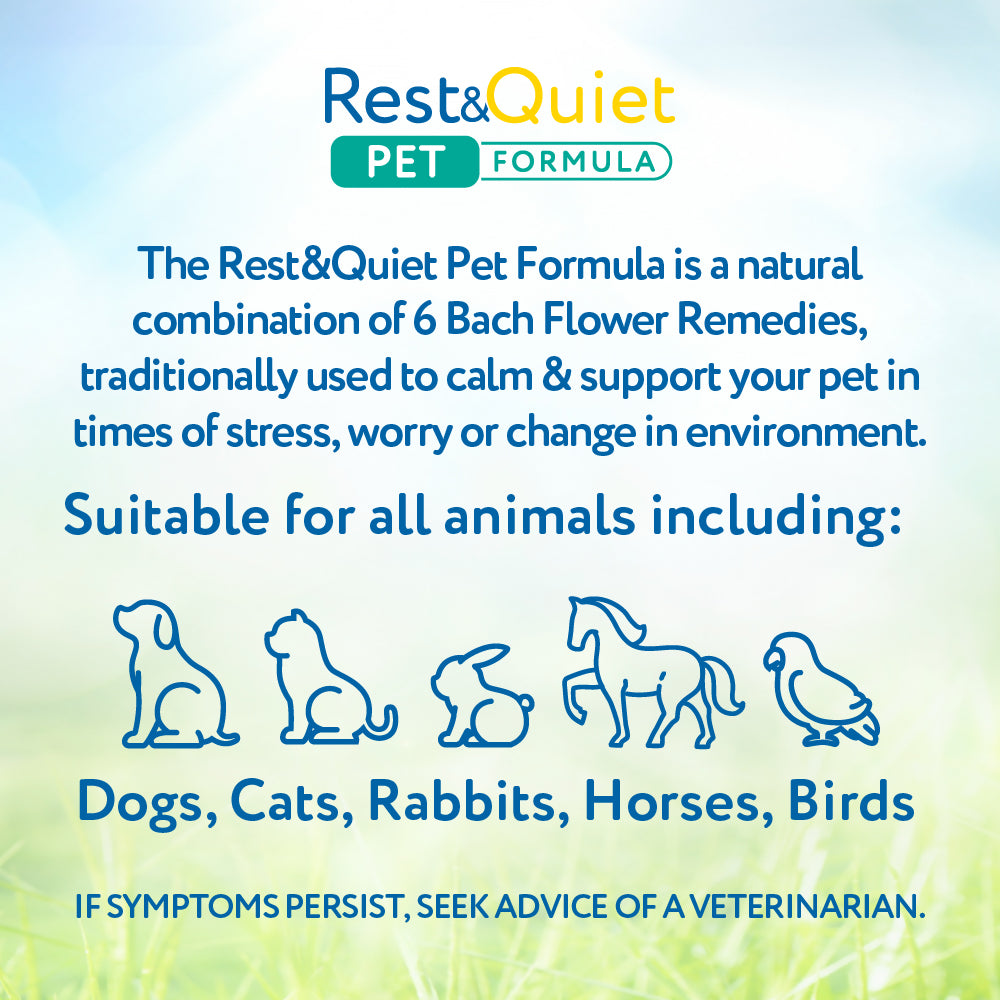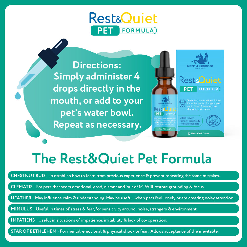 Rest&Quiet Pet Formula is traditionally used in Bach Flower Remedies to calm & support your pet in times of stress, worry or change in environment. An alcohol free, 6 remedy formula, specifically tailored for your pets to give them the emotional support to restore resilience & inner calm in your pets. Manufactured to Dr Bach’s original potency, method & specifications.
