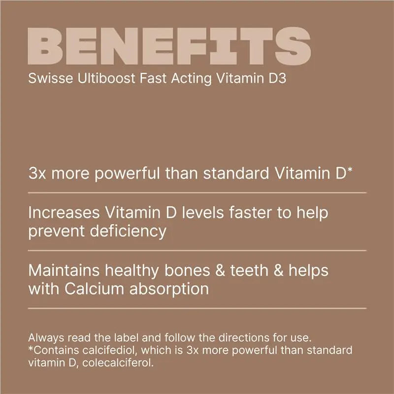 Swisse Ultiboost Fast-Acting Vitamin D3 is a premium quality formula containing calcifediol, which is 3x more potent and, with daily supplementation, is faster at increasing levels in the body than standard vitamin D (colecalciferol).