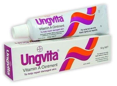 Ungvita Vitamin A Ointment. To help repair damaged skin. Ungvita Vitamin A Ointment is a petroleum jelly base, rich in Vitamin A, and is Lanolin free. Use and Mode of Action: For the effective treatment of dry skin conditions such as chafed skin, cracked heels and cracked nipples, and minor skin disorders such as wounds, scratches, eczema, dermatitis, cuts and abrasions. Dosage and Frequency (based on adult dosage): Apply liberally and rub into the affected areas.